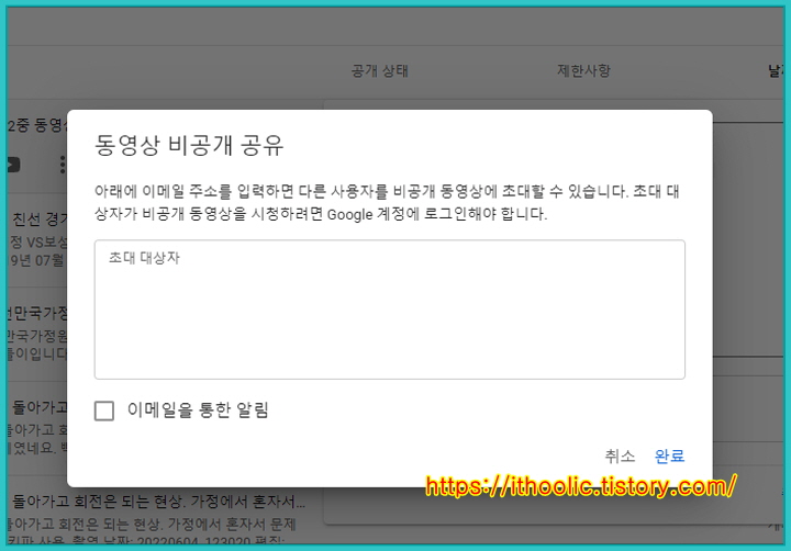동영상을 업로드는 해야겠고, 다 보여주기는 싫고 딱 보여주고 싶은 사람에게만 보여주고 싶을 때 써먹는 방식입니다.